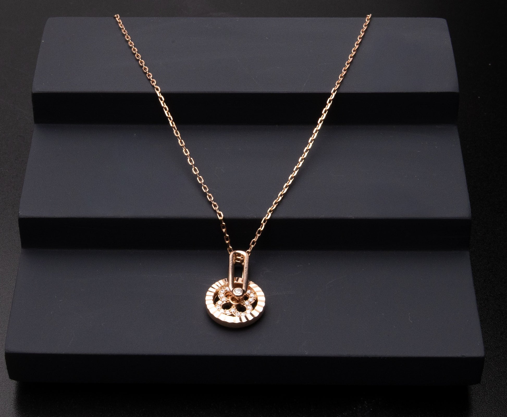A chic rose gold necklace featuring a round pendant with a floral-inspired zircon cluster. Its modern design and subtle sparkle make it perfect for everyday elegance.