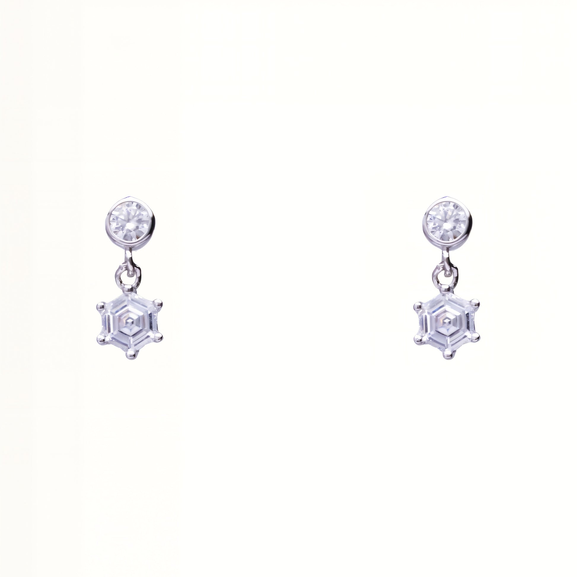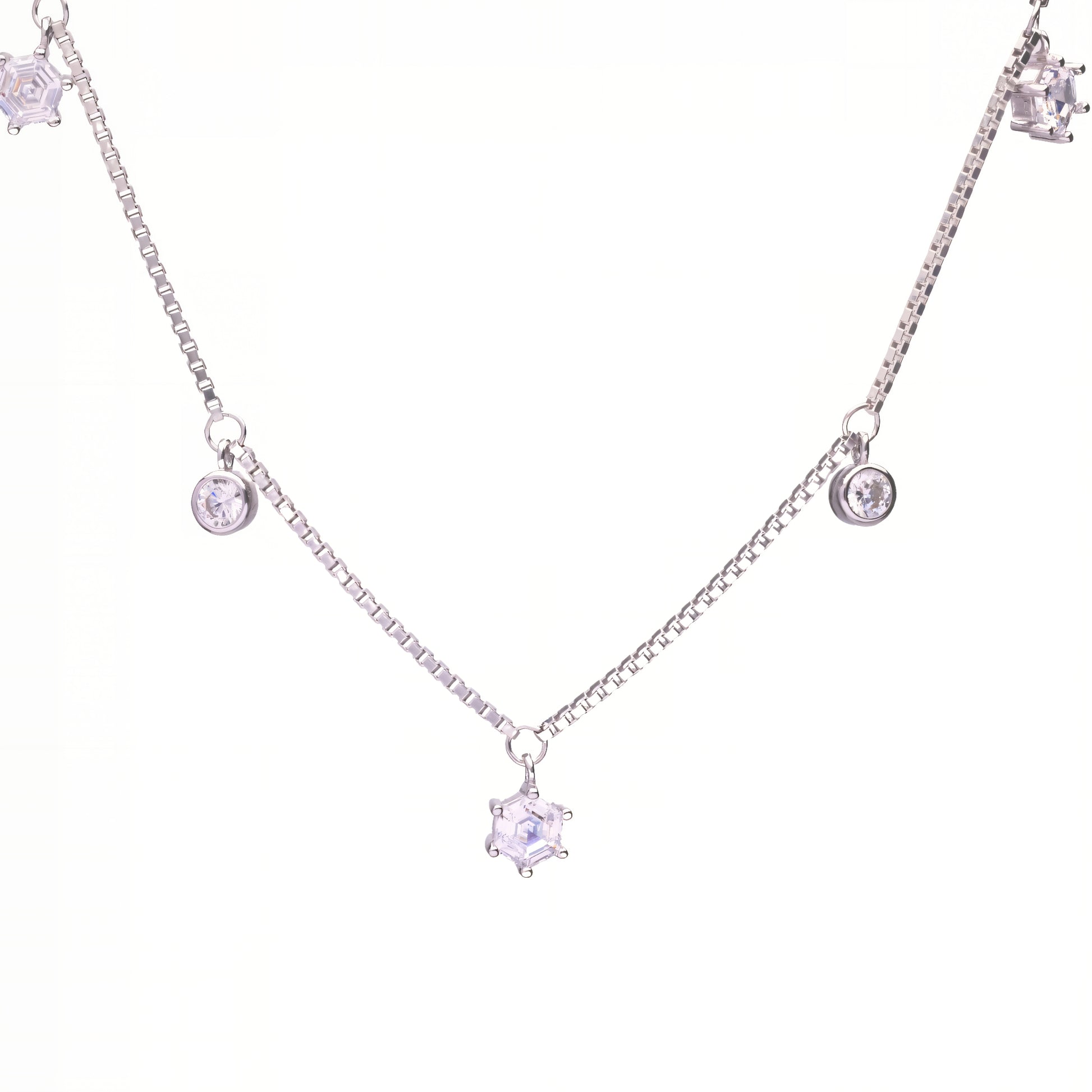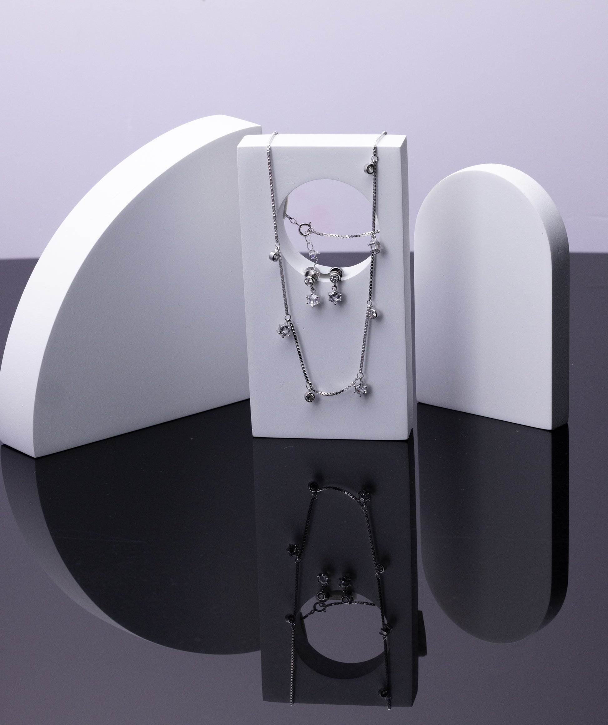 A dazzling silver necklace set featuring a star-shaped pendant, with matching star-shaped diamond accents dangling on either side, paired with coordinating dangling earrings. Sparkling, elegant, and celestial-inspired.